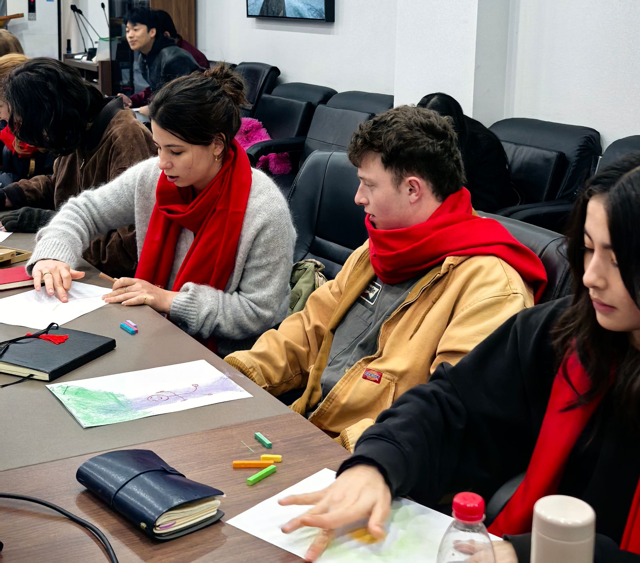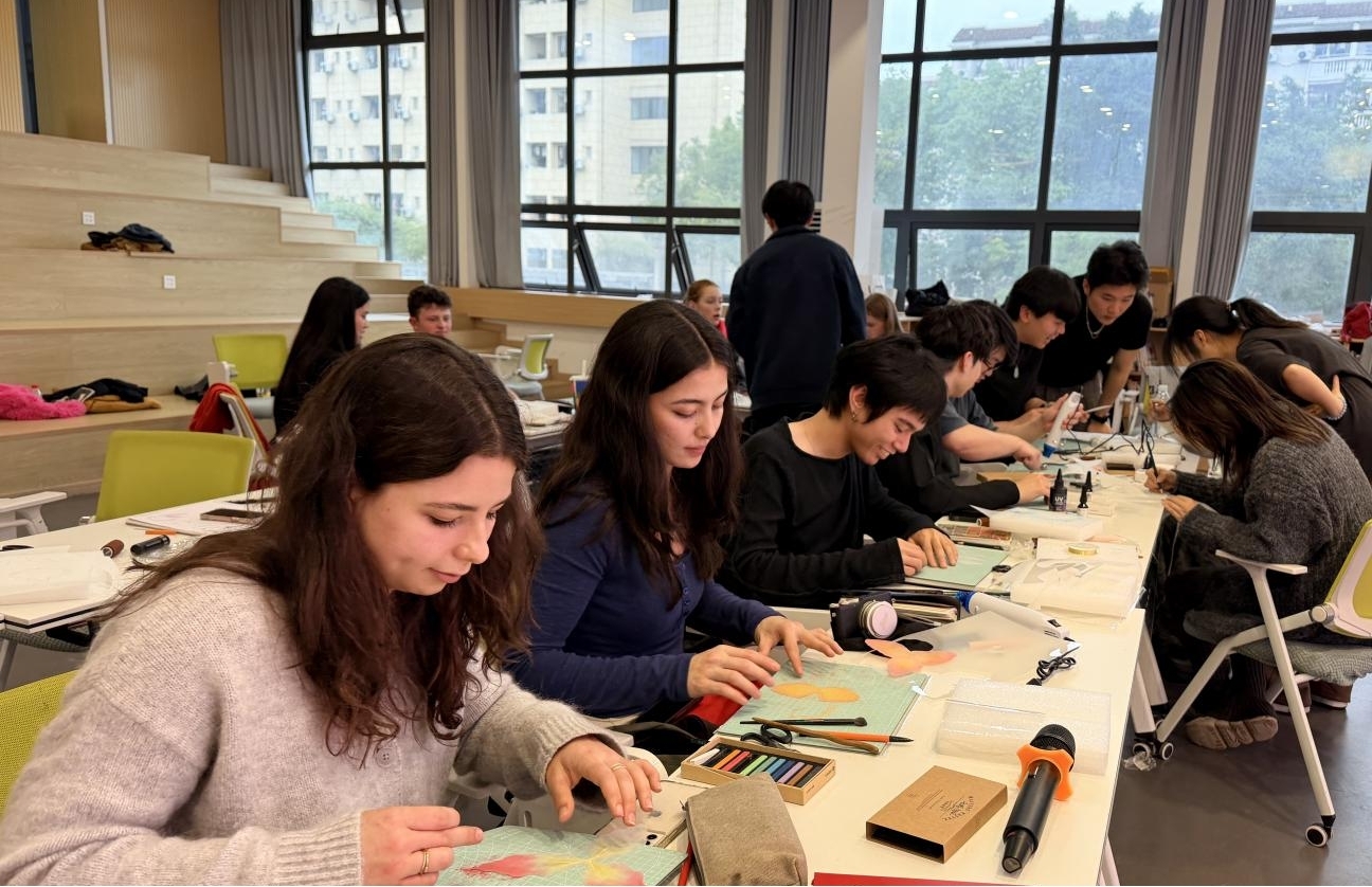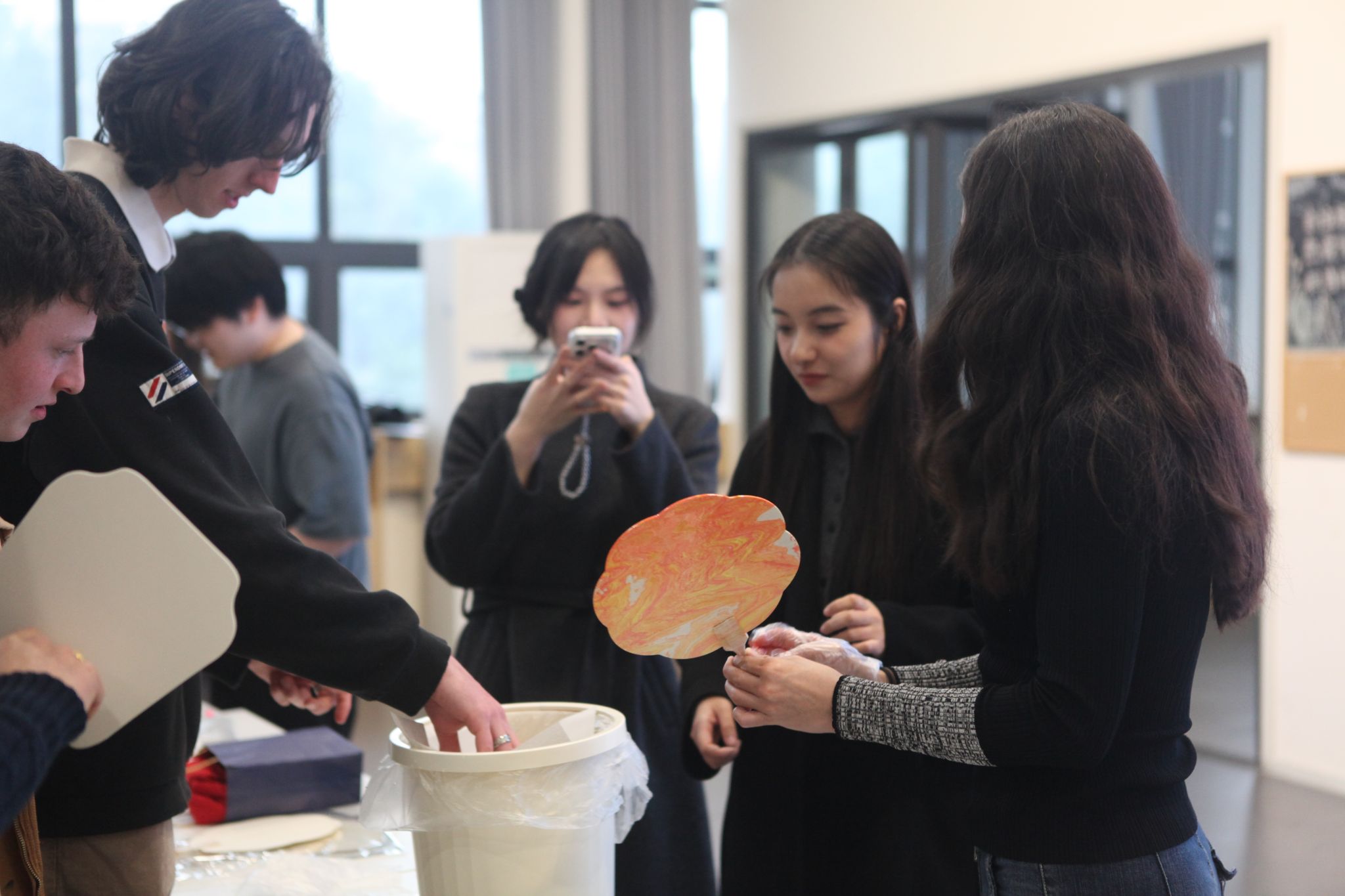 在中国文化艺术工作坊,杨嵋副教授带领师生制作团扇、发簪,体验艺术疗愈,在水墨氤氲间感受墨池法的气韵生动,融技艺与哲思于一体,师生们完成了一次对中国文化从外显形式到内涵底蕴的深度感知。