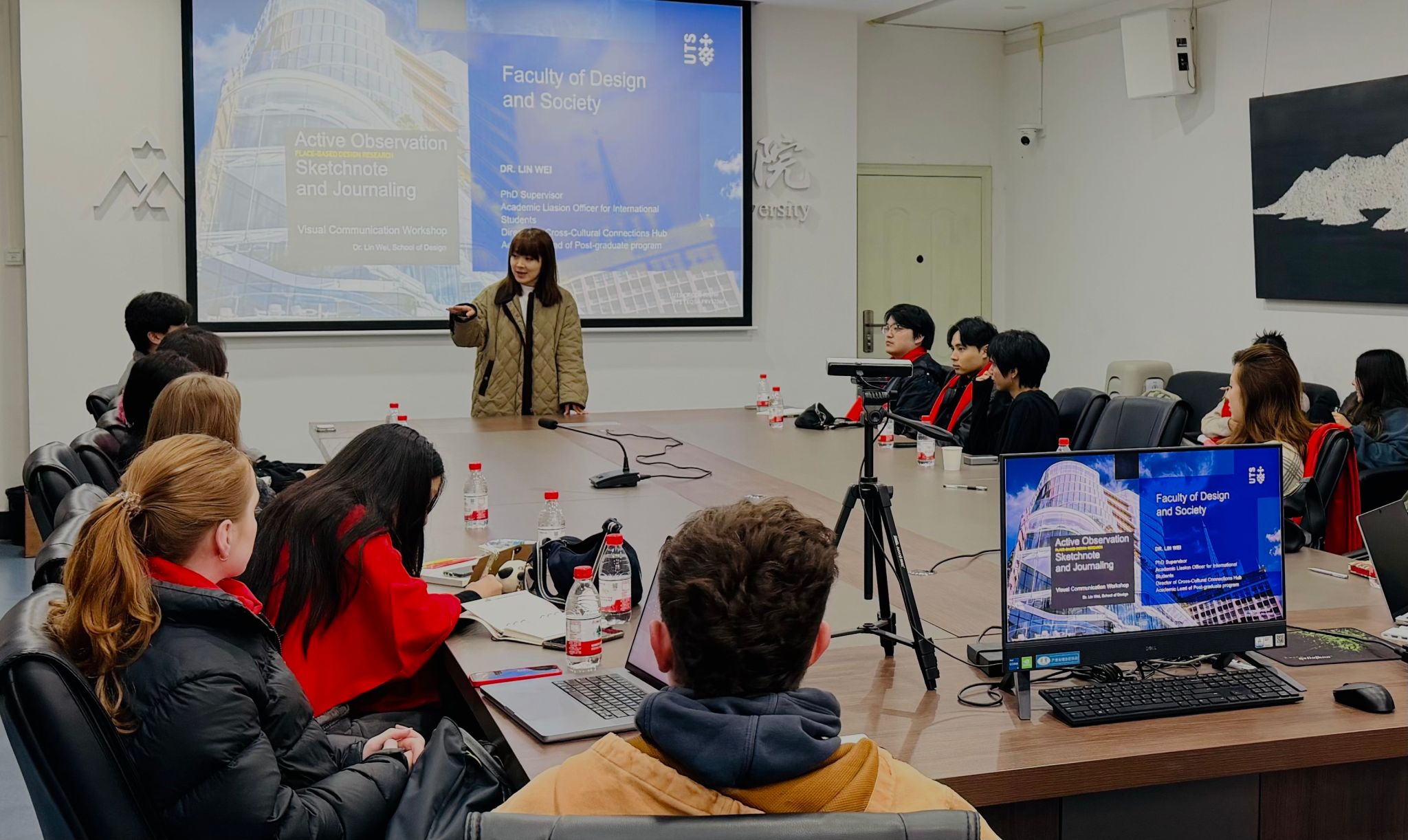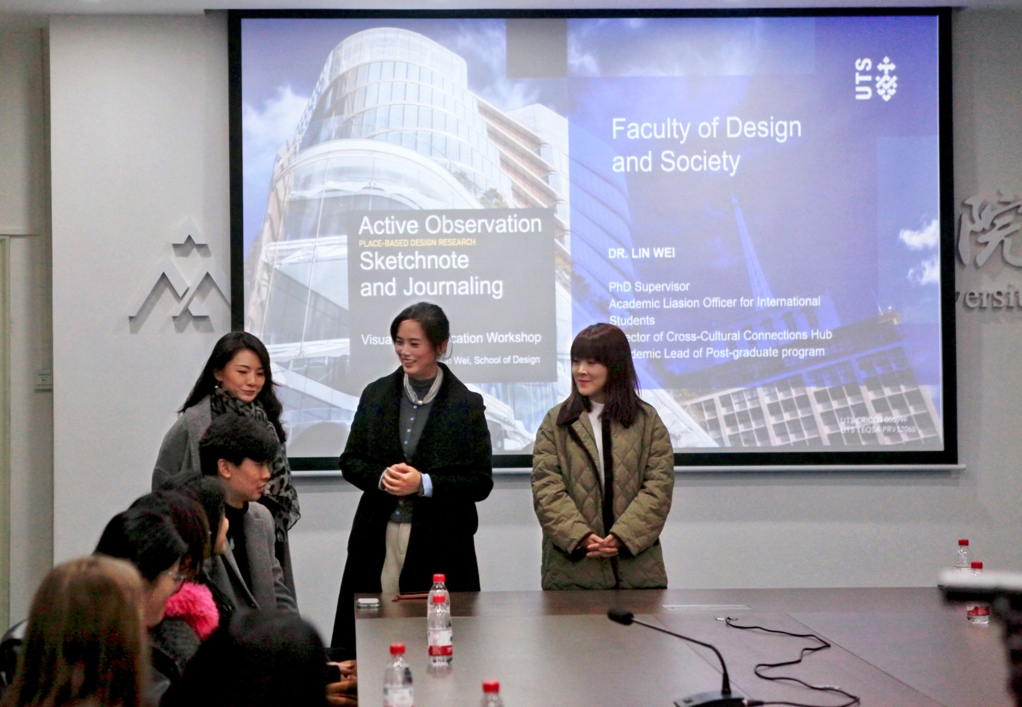 在艺术设计研讨会上,两校师生围绕“全球化背景下的艺术创新”主题展开深入交流。悉尼科技大学博士生导师韦琳老师作学术导读,提出设计学作为应用学科,更需要不同文化背景下的思维碰撞。