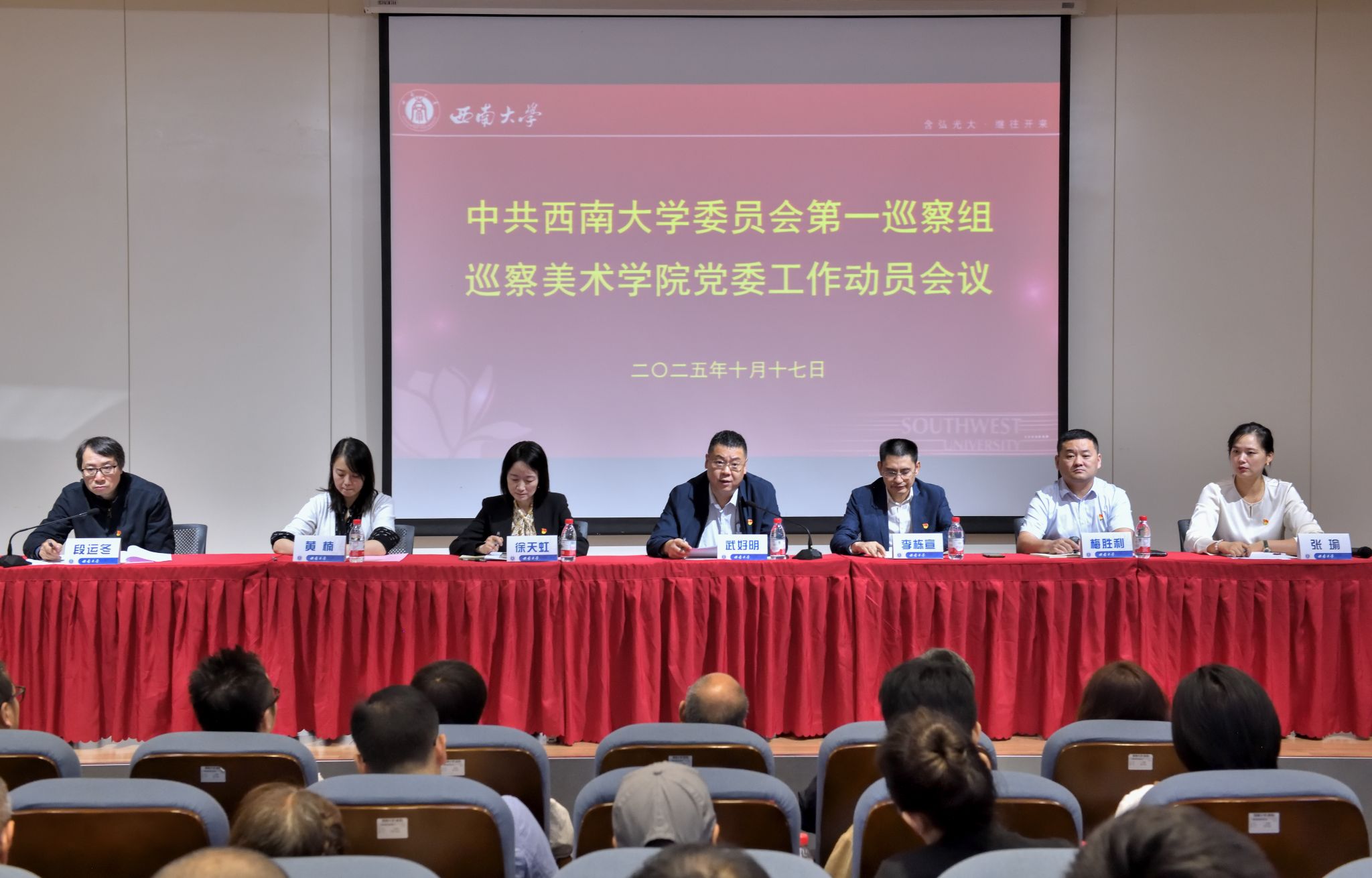根据中共西南大学第四届委员会第一轮巡察工作统一部署,10月17日下午,学校党委第一巡察组巡察美术学院党委工作动员会在美术学院306报告厅召开。学校党委副书记、巡察工作领导小组副组长武好明出席会议并讲话,第一巡察组组长、校党委委员、学生职业发展与就业服务中心主任李栋宣作巡察工作动员讲话。校纪委副书记、纪委办主任、巡察办主任徐天虹及第一巡察组全体成员、学院领导班子成员、全体教职工、离退休领导代表及学生代表参加了动员大会。会议由学院院长段运冬主持。